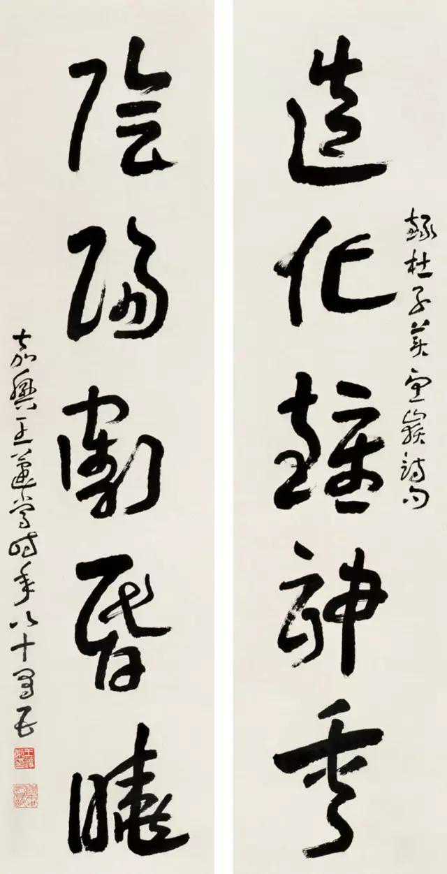 王蘧常章草简练化的用笔追求着丰富的字的结构变化,在搜罗古文奇字的造型美方面,独出心裁,建立了迥异流俗的自家章草体。透过字形与笔法的显在表现,我们赏会到一种夭娇不群的“奇古”意气,落落大方,纵横捭阖,实为创造。王的草书,独标奇绝与浑朴古迈,实在是数百年来独张一军。因此,书坛常以“蘧草”称呼王蘧常的章草书法。