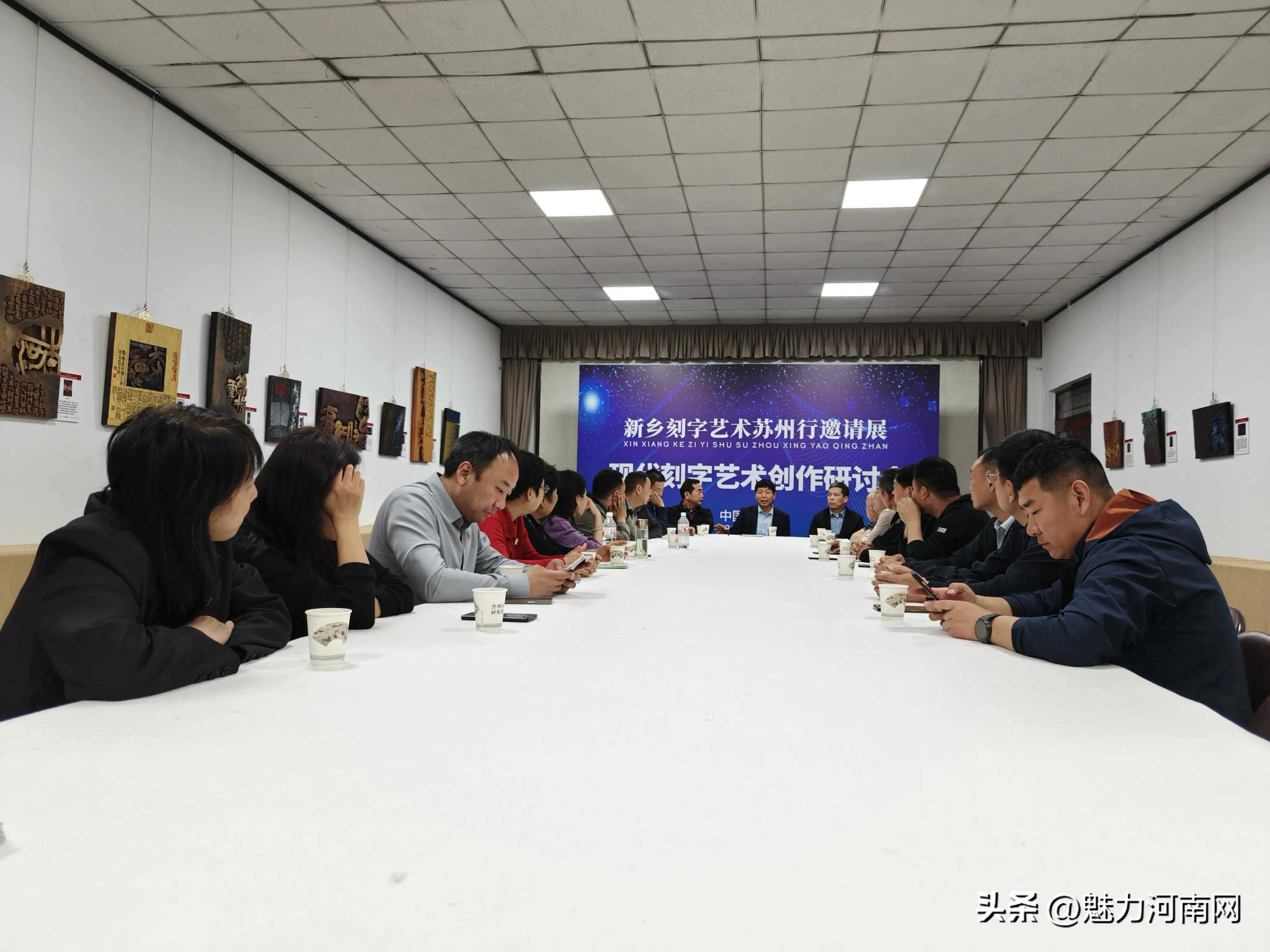 新乡刻字艺术苏州行作品展是一次具有独特意义的艺术活动,内容主题鲜明、思想深刻,既体现了作者的家国情怀,也彰显了其作品的精神能量、文化内涵和艺术价值。他们秉持文艺为民初心,把个人的道德修养、艺术追求同国家前途、民族命运、人民愿望结合起来,展示中华文明和中国传统文化精髓,用刀、笔倾心讲好中国故事,使作品真正与时代的精神、历史的浩然、社会的正气、生活的真谛、人民的善良浑然一体,从而实现了书法理想与时代精神表达的有机契合,极大地提升了作品的亲和力和感染力。开幕当日,举行了现代刻字艺术创作研讨会,与会嘉宾与参展艺术家进行了互动交流,参展作者先后进行了发言。