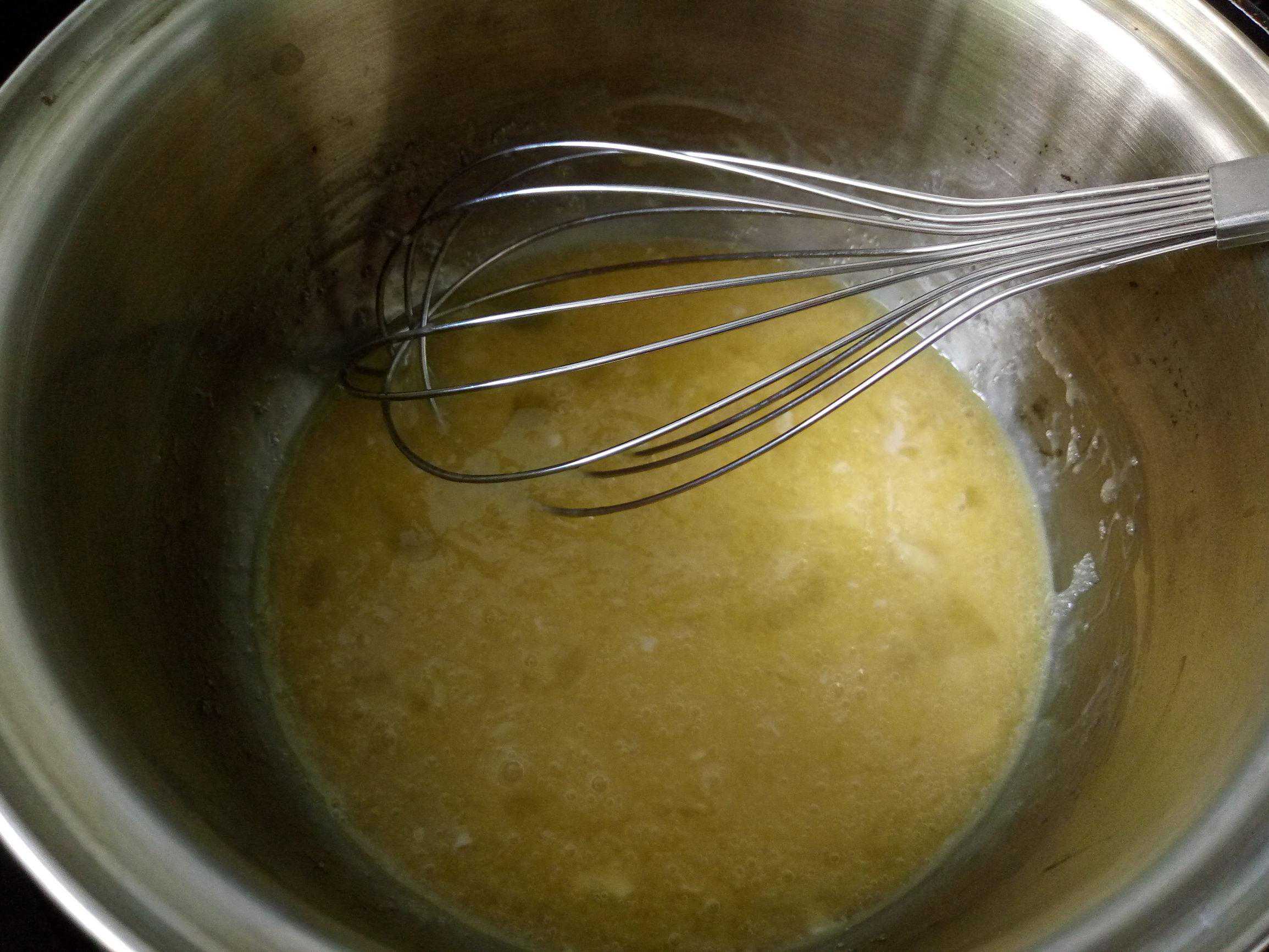 1.首先制作奶黄馅。黄油隔水加热融化成液体。
