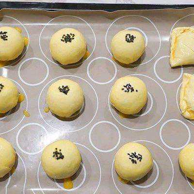 7、刷上蛋液、撒上少许黑芝麻,送入已预热的烤箱,以180度烘烤20~25分钟就完成了。气炸锅也可以烤,请依照自家烤箱/气炸锅的火力微调烘烤时间(顺便偷渡两个苹果派)