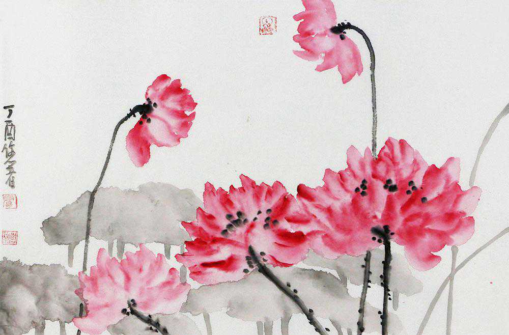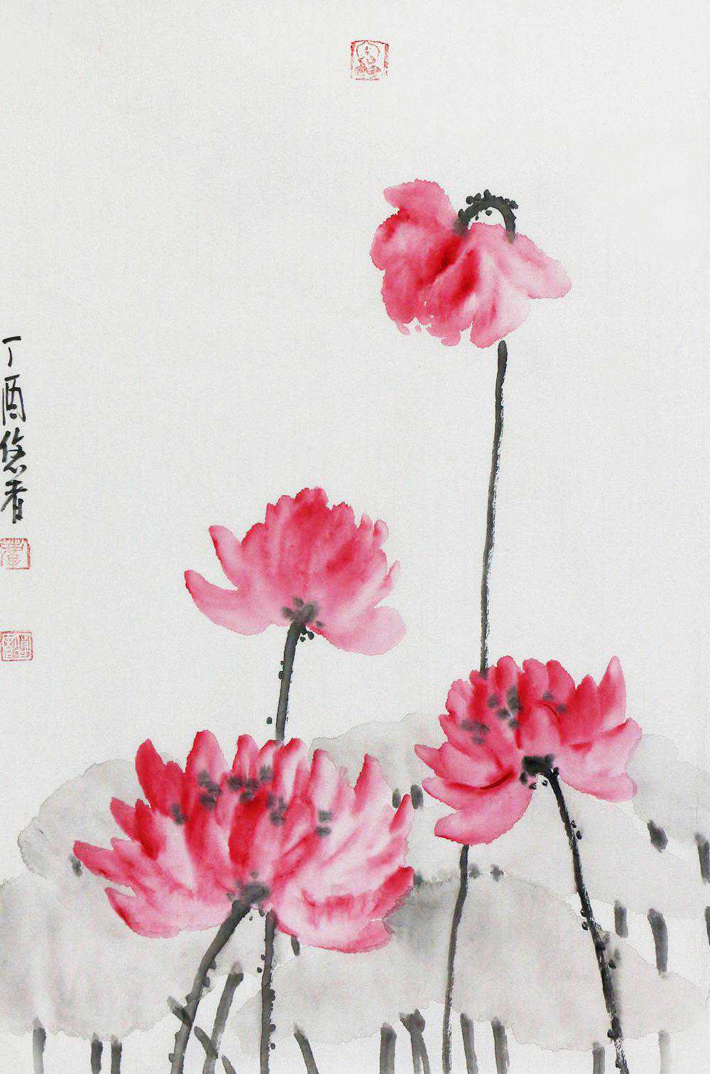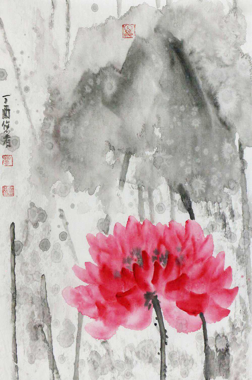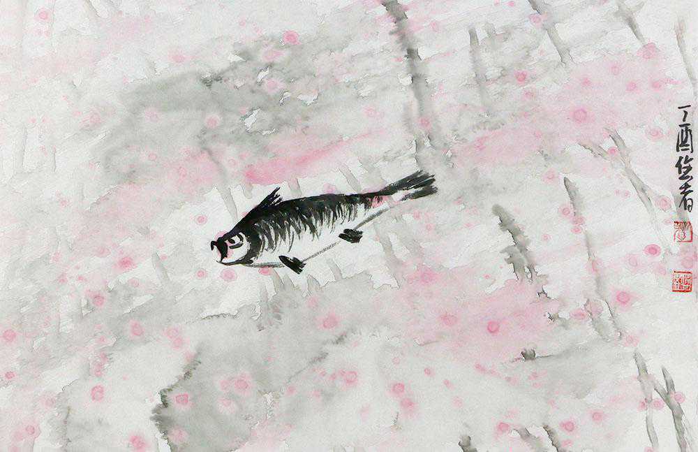 绘画是视觉的,更是心灵的,绘画艺术的价值并不只是单单的愉悦感官,更应该是能够慰藉人的灵魂,给人以思想上的升华。这幅花鸟画,宁静莲塘中,荷叶淡淡,粉莲朵朵,朦胧一片,一条鲤鱼畅游其间,清晰生动,令画面生趣盎然。画面背景以淡色为主,与鱼儿的重墨形成鲜明对比,增添气韵,彰显了画家非凡的技法。莲花与鲤鱼寓意连年有余,和谐美观,充满祝福。作品构图严谨,笔墨生动,造型准确,情趣盎然。