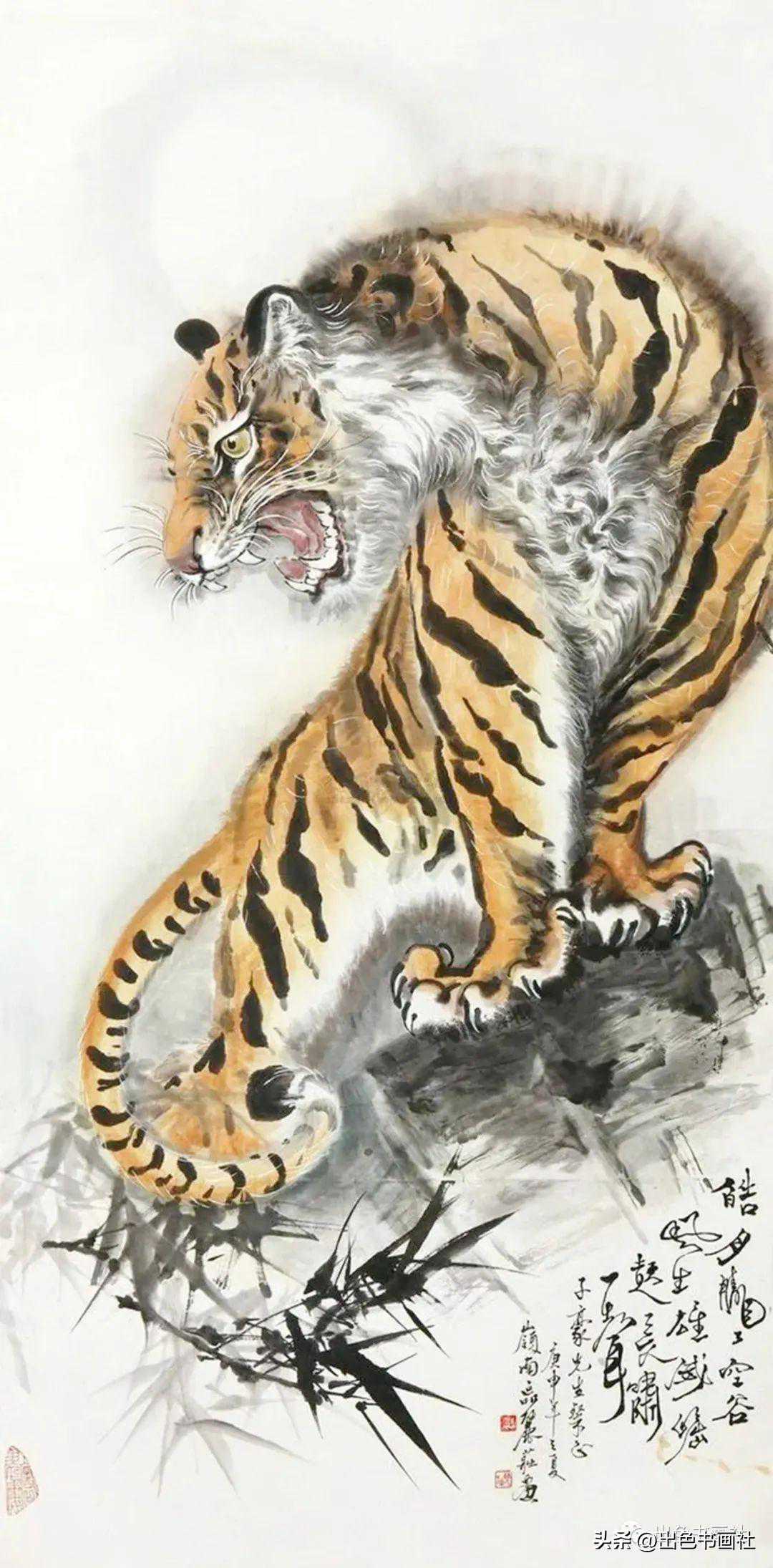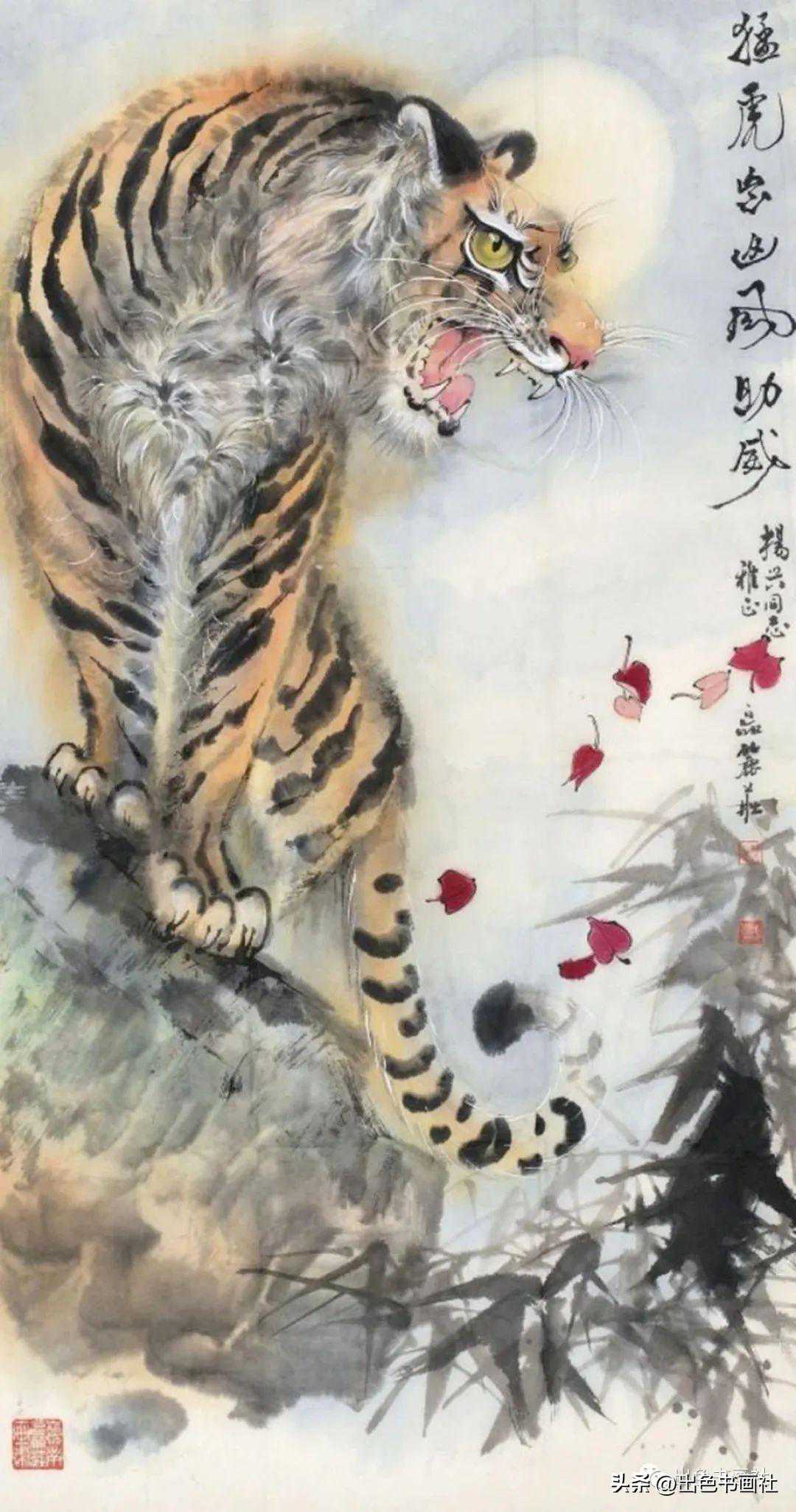 区丽庄落墨泼辣,墨韵生动,笔力苍劲,用笔流畅,富于感情。她笔下的老虎被人们称为“猛虎下山”,威武霸气,气势如虹。