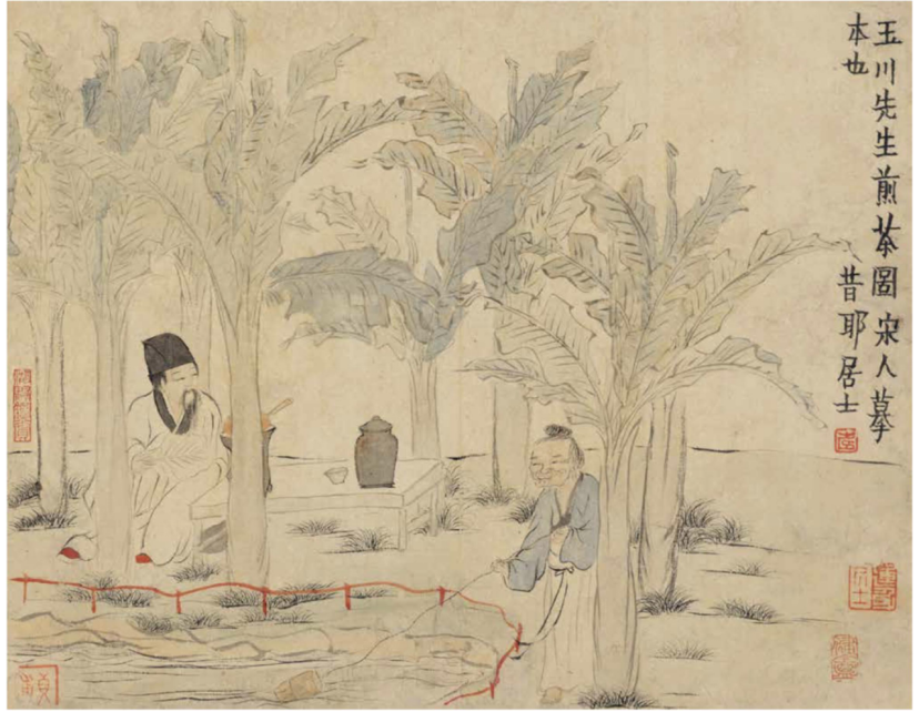 画中正是唐代茶人卢仝在庭院中给水煮茶的情景,虽然所绘为唐代茶事。但从画中树墩上的煮茶风炉与单柄壶来看,表现的却非唐代煎茶法。而是元明流行的煮茶法。煮好的浓茶可用作茶卤,饮用时将茶卤和开水混合,调成浓淡适宜的茶汤。
