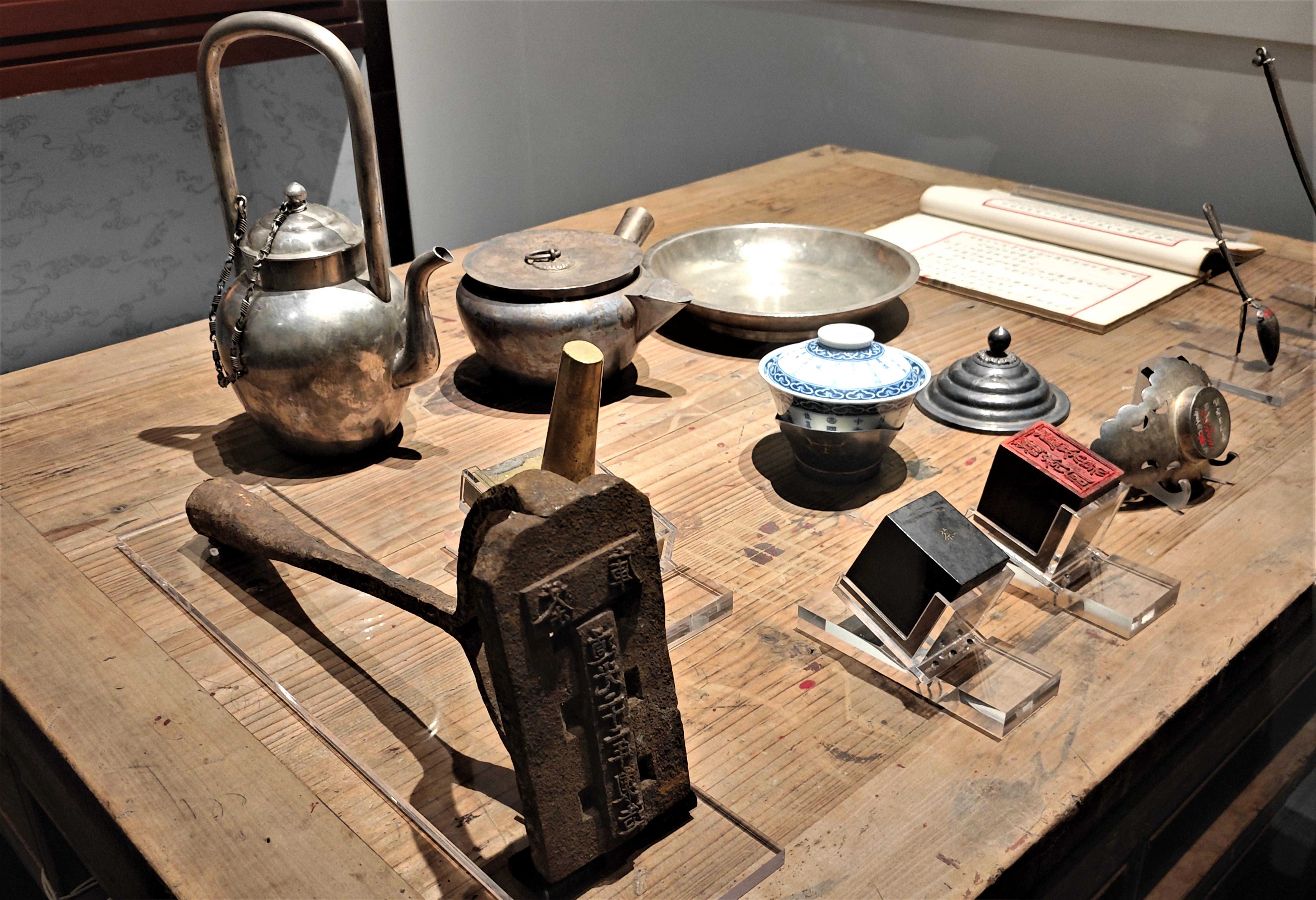 展览中还有来自英国、日本、俄罗斯的茶器精品,还有清代宫廷中使用和收藏的来自异域的茶器,以及由清宫造办处制作的外国风格的茶器。比如:故宫博物院收藏的日本银鸢尾花纹茶具套装、法国蓝釉描金寿字纹茶具、俄罗斯银刻花双耳六足盘,以及维多利亚与艾伯特博物馆收藏的“中国风”茶具、英国沃克斯豪尔瓷厂烧造的软瓷印花青花庭院图茶叶罐、德国麦森瓷厂烧造的红陶模印花卉纹壶、珐琅彩描金人物图杯及杯托等。