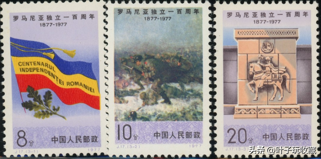 J17—罗马尼亚独立100周年此套邮票由吴建坤设计,于1977年5月9日发行。全套3枚,分别为罗马尼亚独立节、勇士们向点冲锋、勇敢的米哈伊,全张为56枚,影写版,发行量560万套。