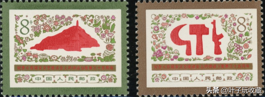 J18—纪念《在延安文艺座谈会上的讲话》,发表35周年此套邮票由万维生设计,于1977年5月23日发行,全套2枚,全张为50枚,影写版,发行量1000万套。