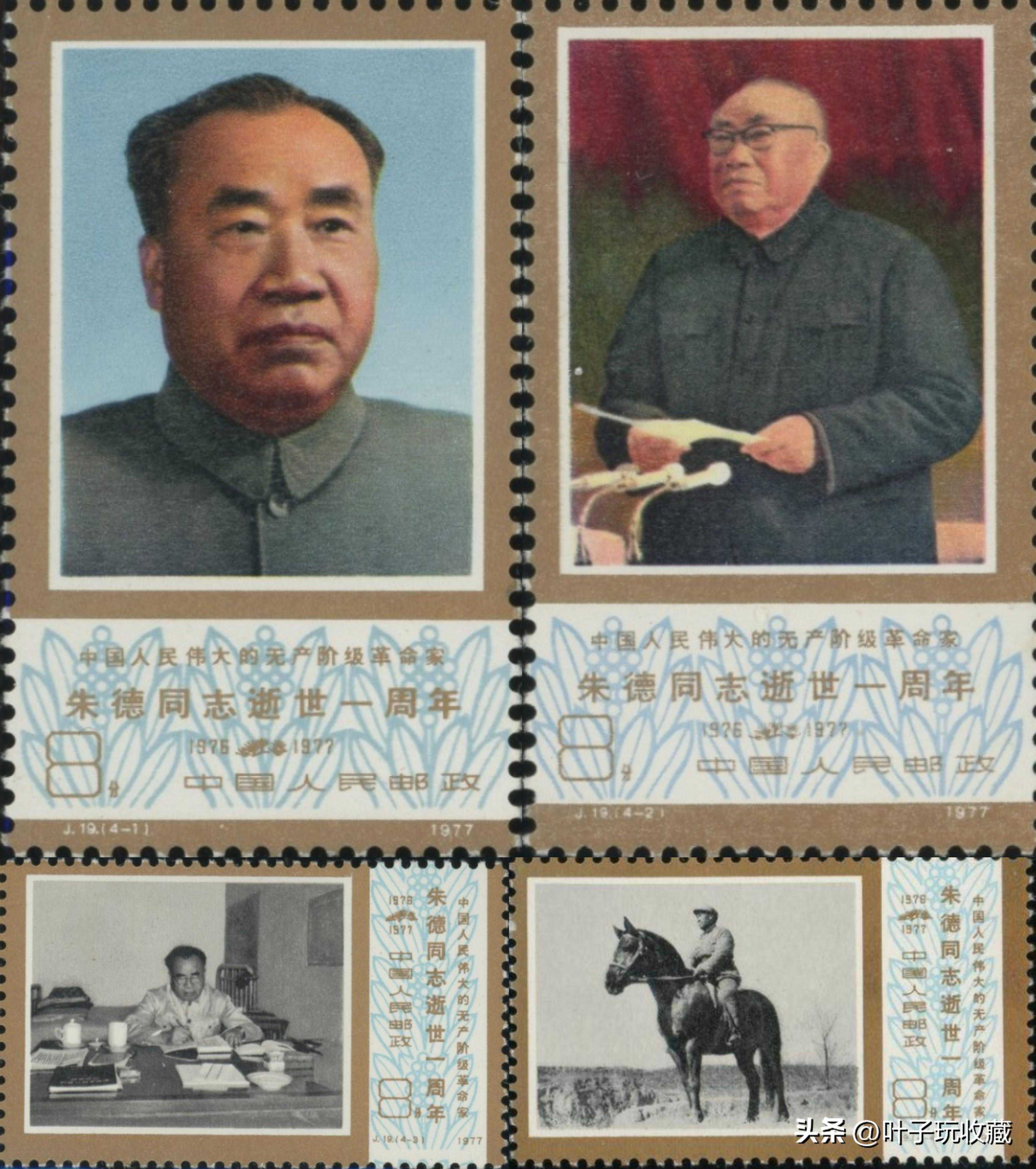 J19—中国人民伟大的无产阶级革命家朱德同志逝世一周年由任宇设计,于1977年7月6日开始发行,全套4枚,全张40枚,版张有31x52、52x31mm两种不同规格,影写版,发行量3000万套。