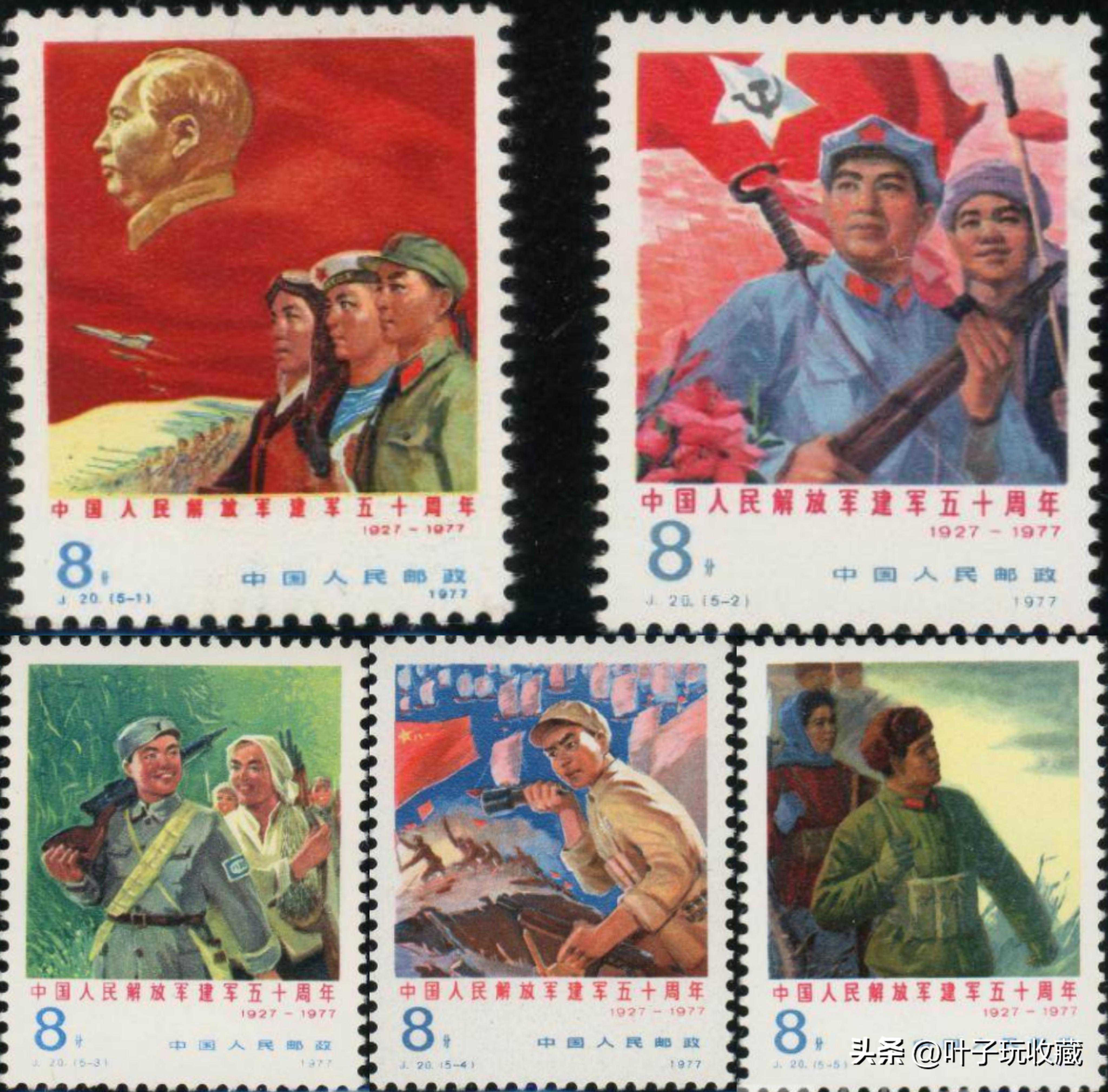 J20—中国人民解放军建军五十周年由李印清、张克让共同设计,于1977年8月1日发行。全套5枚,主题分别为加速我军革命化现代化建设、井冈山军旗红、游击健儿勇、雄师过大江、钢铁长城,全张为50枚,影写版,发行量1000万套。