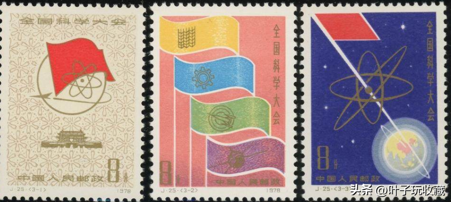J25—全国科学大会由许彦博设计,1978年3月18日发行。全套3枚,为科技的春天、向四个现代化进军、努力攀登科学高峰,全张50枚,影写版,发行量1000万套。