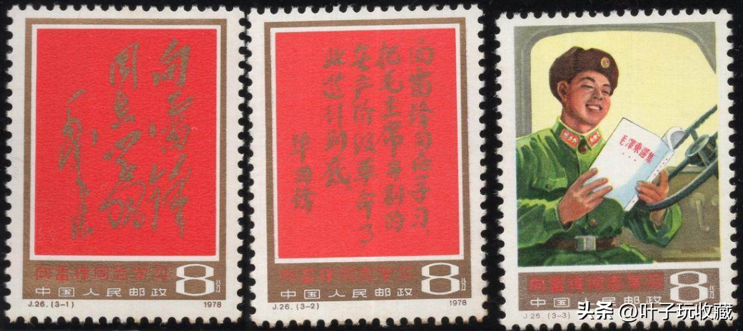 J26—向雷锋同志学习由孙传哲设计,于1978年3月5日发行。全套3枚,分别为毛主席的光辉题词、华图峰的题词、雨露滋润禾苗社,全张为50枚,影写版,发行量1500万套。