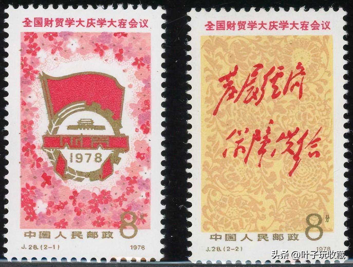 J28—全国财贸学大庆学大寨会议由陈晓聪设计,于1978年6月20日发行。全套2枚,分别为会标、发展经济保障供给,全张100枚,发行量1500万套。