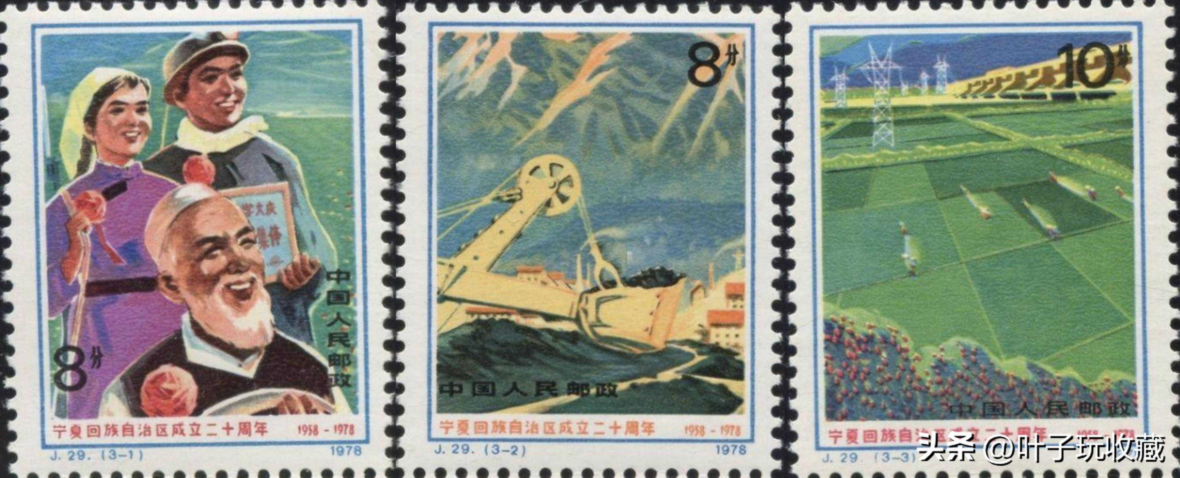 J29—宁夏回族自治区成立20周年由张克让设计,于1978年10月25日发行。全套3枚,分别为建设新宁夏、煤都新貌、塞北江南,全张为50枚,影写版,发行量1500万套。