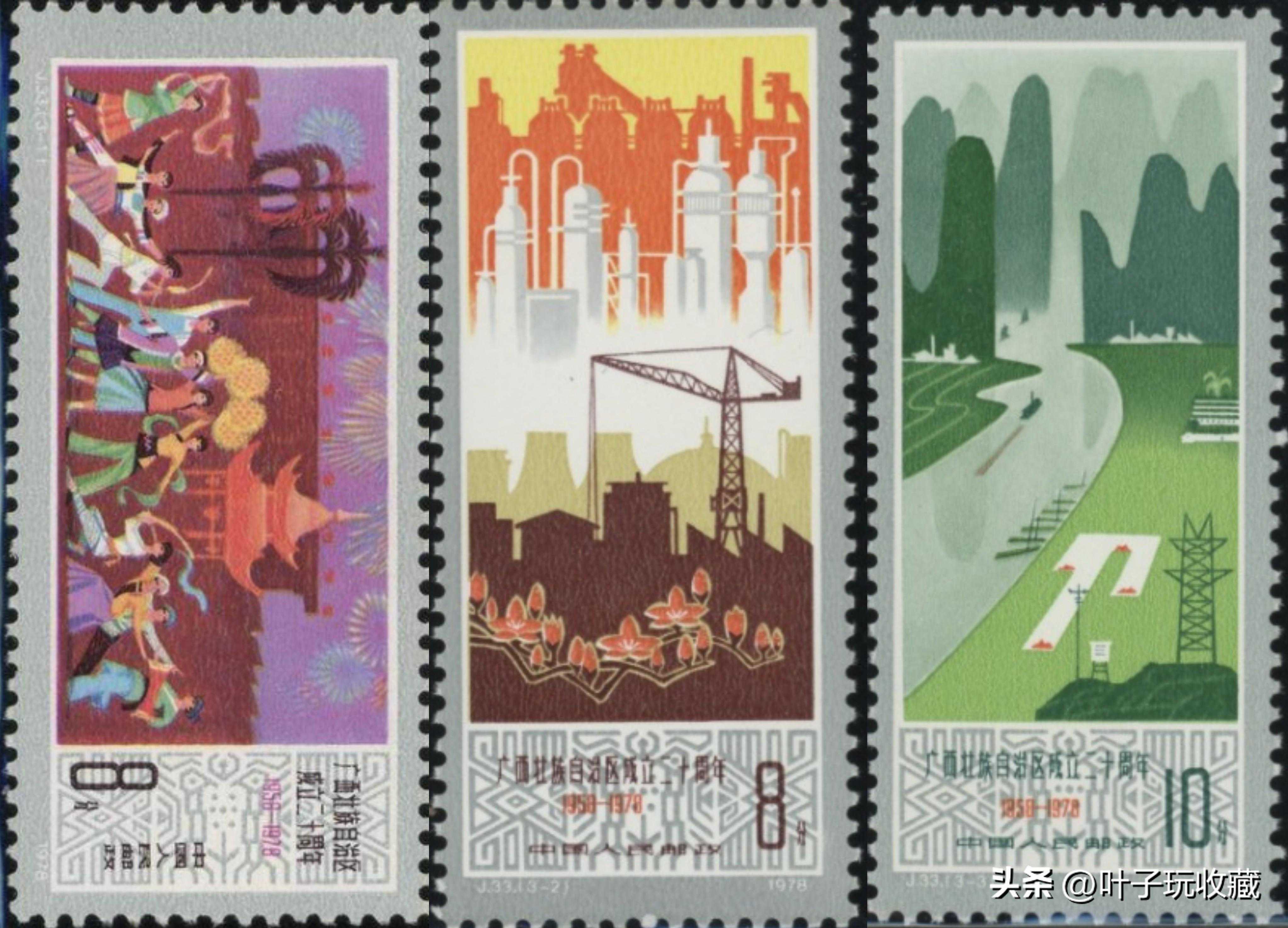 J33—广西壮族自治区成立20周年此套邮票由王明旨、吴祖强,邓二龙共同设计,于1978年12月11日发行,全套3枚,分别为工业、欢庆、农业,全张35枚,影写版,发行量600万套。