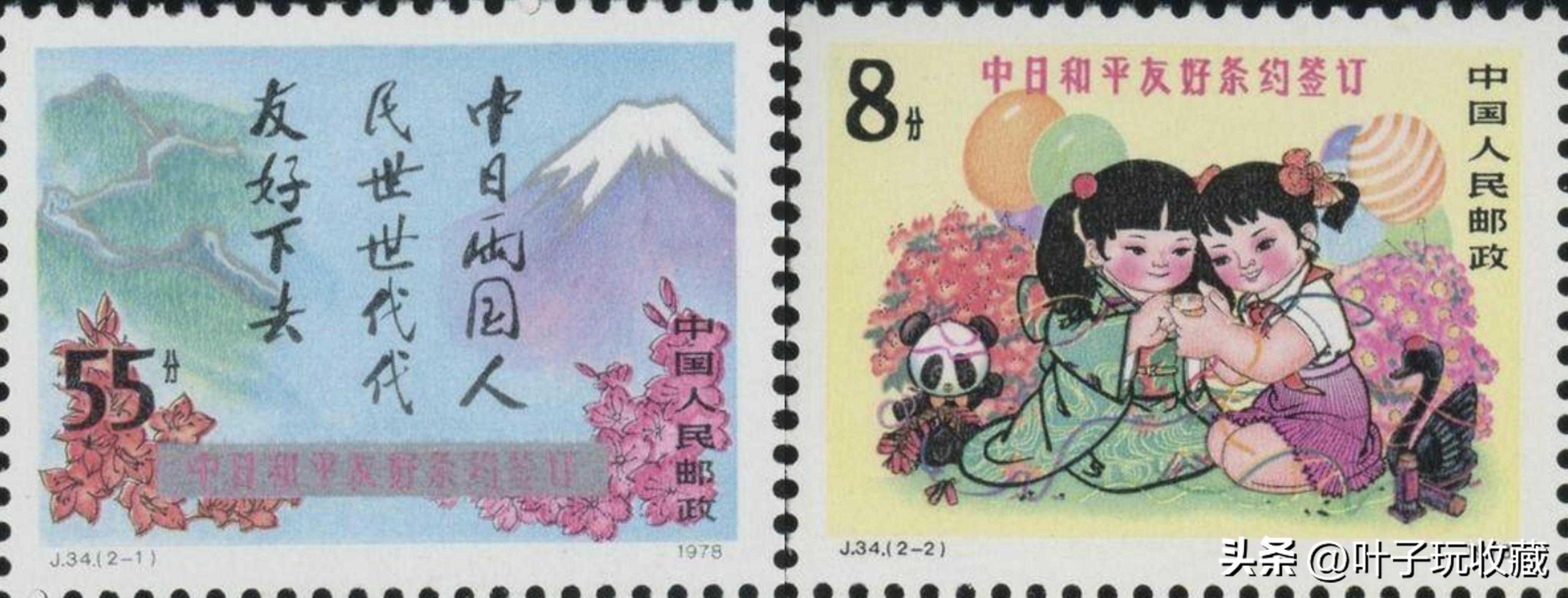J34—中日和平友好条约签订由潘可明设计,1978年10月22日发行。全套2枚,分别为共同愿望、中日人民世代友好,全张为50枚,影写版,发行量9250万套。