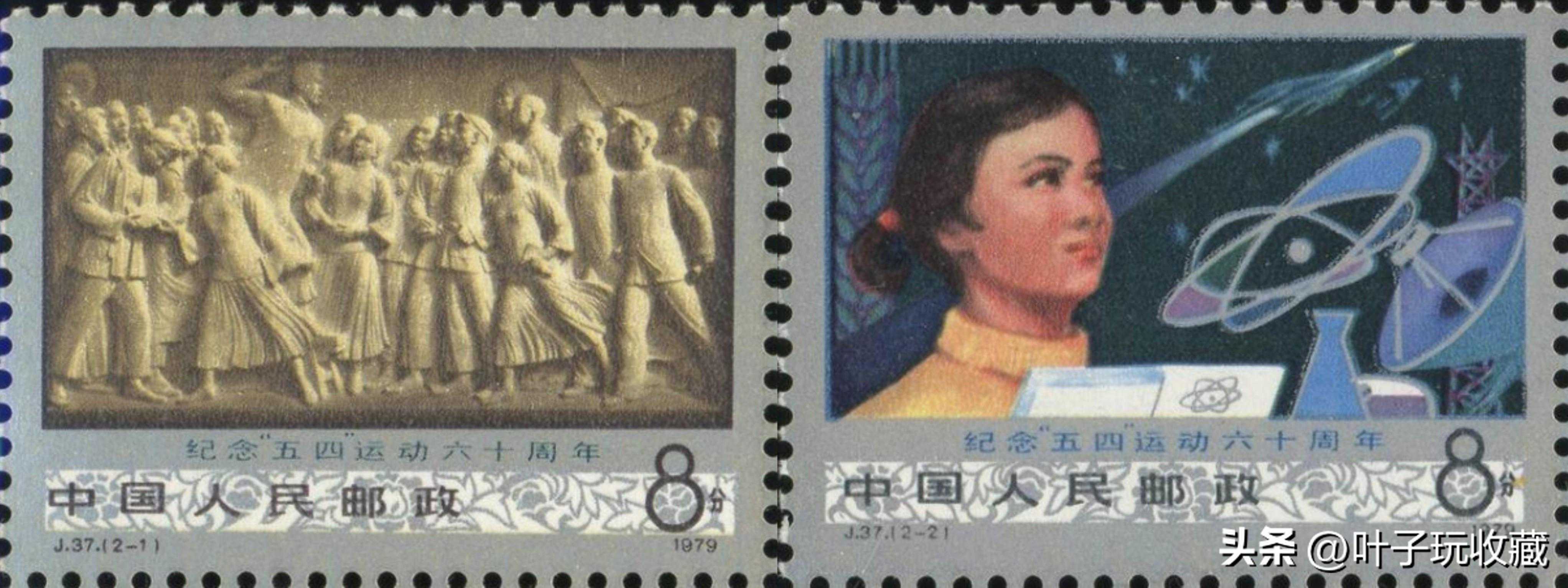 J37—纪念“五四”运动60周年其邓锡清设计,于1979年5月4日发行,全套2枚,全张50枚,影写版,发行量1000万套。