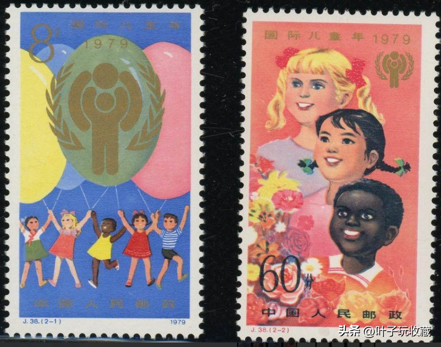 J38—国际儿童节由邹建军设计,于1979年5月25日发行。全套2枚,分别为国际儿童年标记、幸福成长,全张为40枚,影写版,发行量120万套。