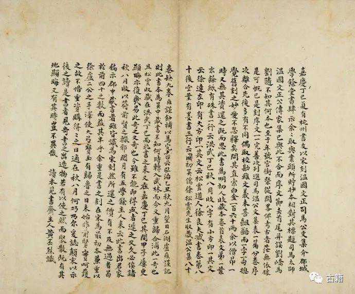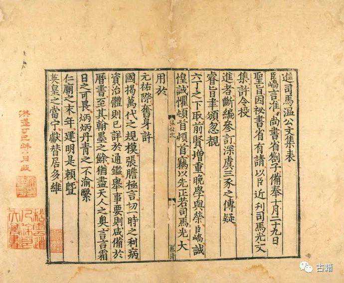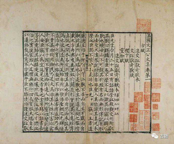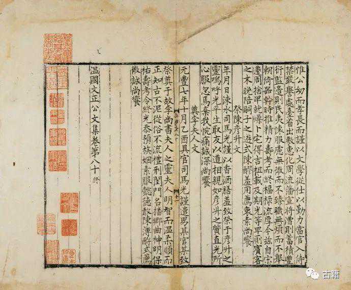 《温国文正公文集》八十卷,(宋)司马光撰。宋刻本(卷一至四、七十七至八十配明弘治十八年卢雍抄本)。卢雍、黄丕烈跋,钱大昕题款。框高十九厘米,宽二十四·六厘米,每半叶十二行,行二十字,白口,左右双边。