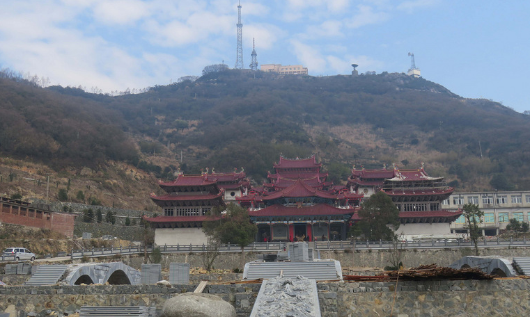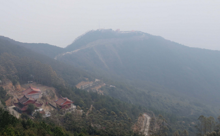 与凌云殿成一条线,若站在殿正中玉皇至尊案前,向正南望去,金炉峰尖刚好在殿门屋顶正中,峰坡上已建有歇凉亭、栖云亭等三个亭,可北望凌云殿福源寺全貌。