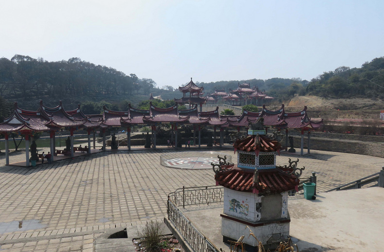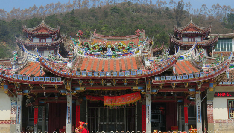 为兜率天宫,两旁钟鼓楼,再后为大雄宝殿殿前开三门,拜亭、亭外为大石埕,西边为戏台,东边为山门,整个建筑群依山而造,后面层层而上,周围劲松古樟奇花异草,为游览朝拜胜地。
