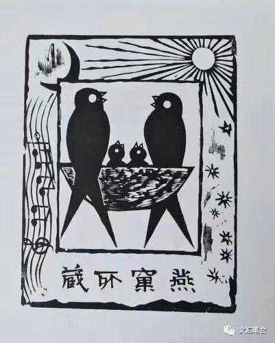 他给黄裳刻的那枚藏书票,上穷碧落下黄泉,都没有找到。我只能等待奇迹的出现,几年过去了,日子平平淡淡,奇迹仍然未见。黄先生似乎开始有意地总结一生的劳绩,多次提到要开一个别开生面的百岁画展。2021年冬,“入木——黄永玉木刻展”来沪展出,他一辈子木刻的精华都在这里,面对四百多块木板,他曾感慨:“这一堆的骸骨啊。”我在场中欣赏着不同时期的木刻,大概在后面的某个展厅,一枚小小的作品锁牢了我的目光。画面的中间站在燕窝上的两只硕大的燕子,相对而鸣,在它们中间是两只抬着头张着嘴的小燕子。环绕它们的是月亮、太阳、星星,最重要的是左端边缘,是流泻而下的五线谱。票面的下端,是“燕窠所藏”四个大字。——这不就是我苦苦寻找的那枚藏书票吗?我以为相见遥遥无期,不承想柳暗花明,再也没有比这样的意外相逢更让人高兴了。
