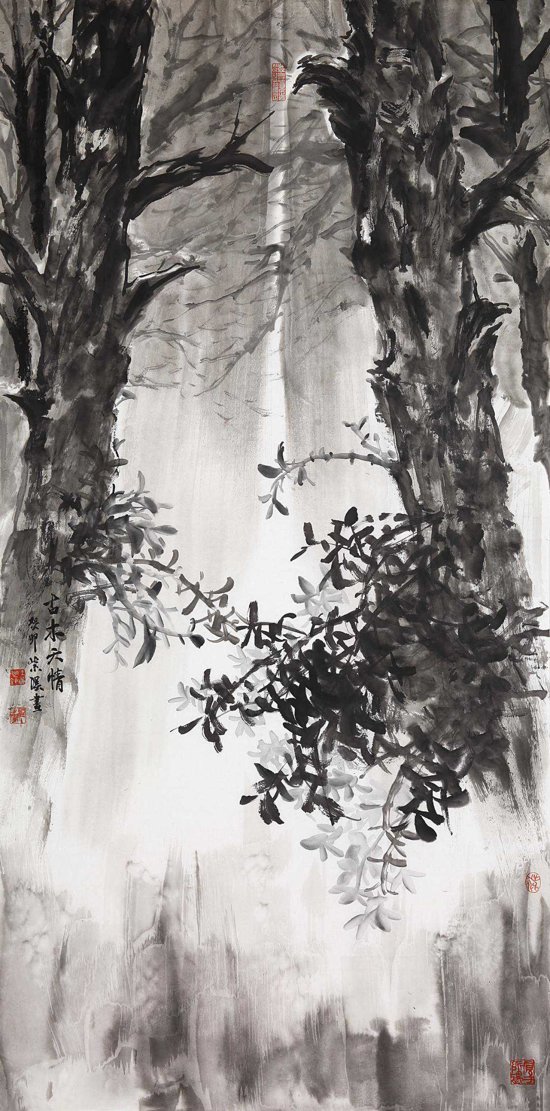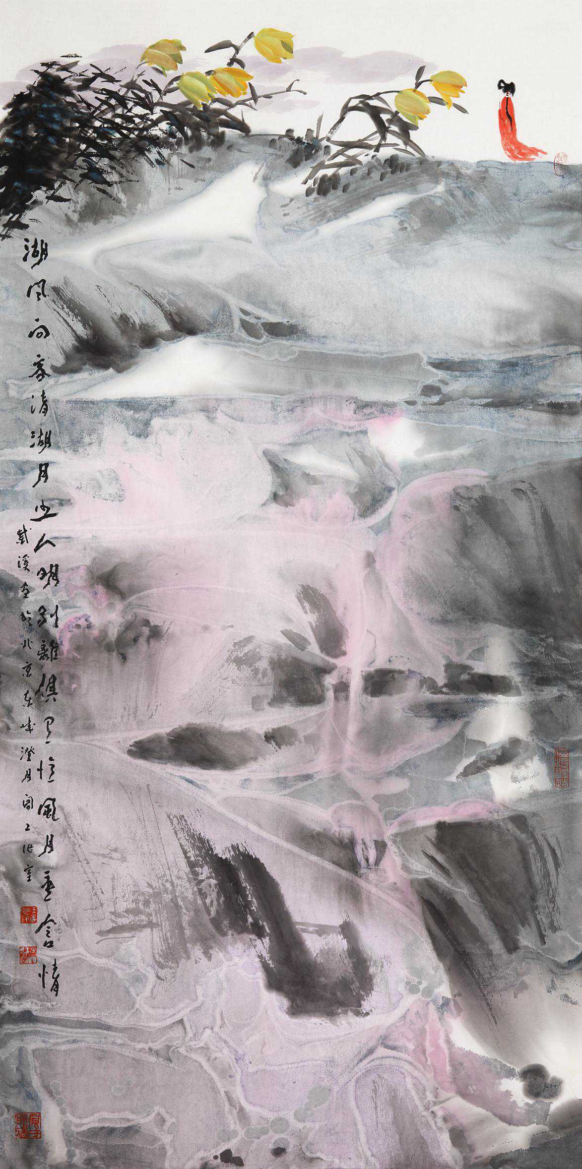 书法专攻秦简牍书体,笔法揉篆隶风貌,笔力苍茫劲健。国画专长泼墨泼彩花鸟及山水,文学功底深厚,且多年研究佛学及易经国学,思想深邃,其作品兼具文人画的雅致,风格空灵婉约,融入了多维度空间的深邃意境,透出灵魂深处的遐想和思考。