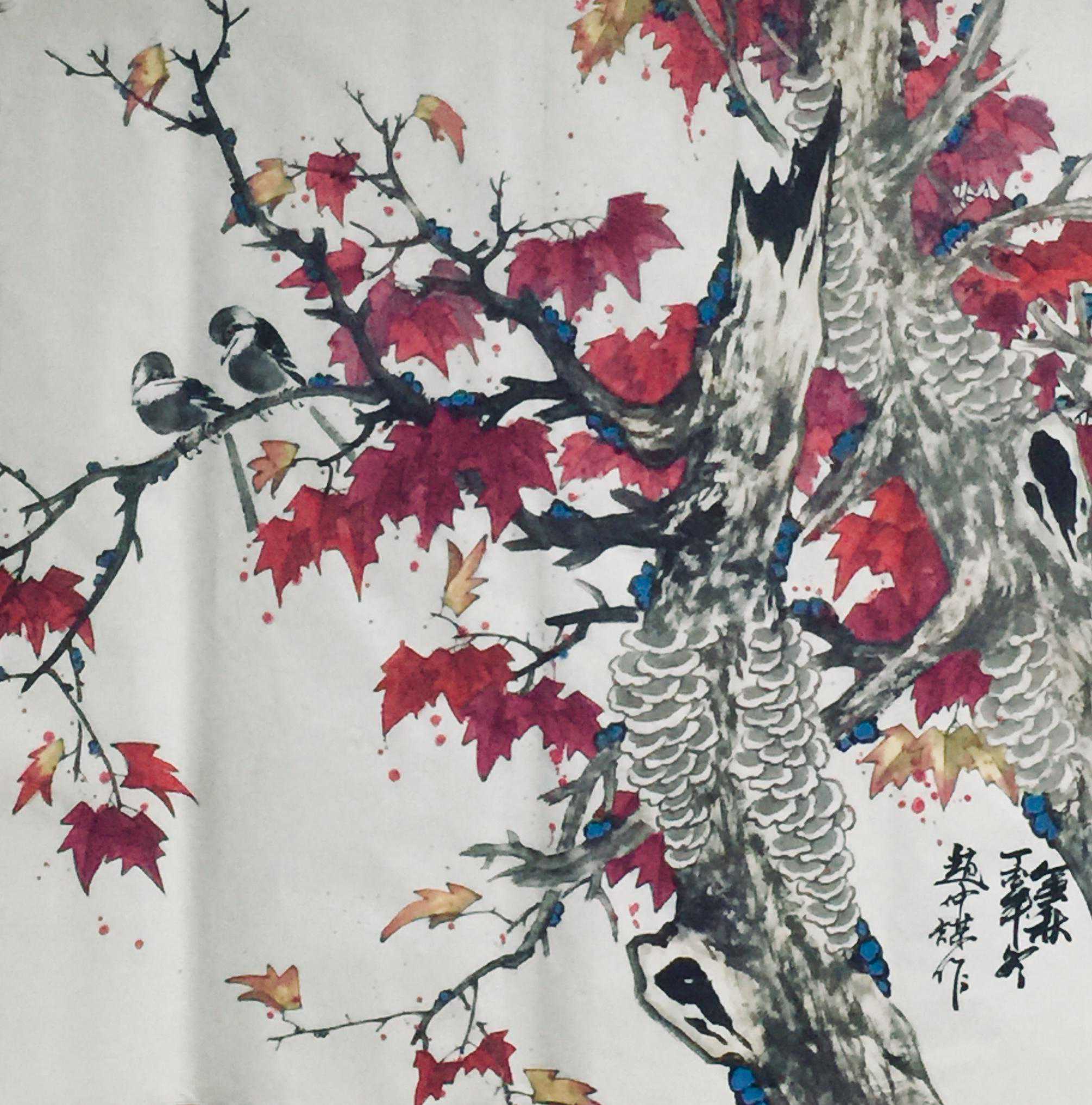 赵仲谋在写好书法艺术的同时,经过西安美院、清华大学美术学院高研班的进修,对花鸟画尤其山水画有了飞跃的进步,在他的画室看到了许多巨幅花鸟、山水创作作品。因在长期的探索与写生和进修的理论指导下,逐渐找到了一种属于自己的绘画语言,这种语言是新颖的,是建立在大写意与工笔花鸟上寓于表现力的,是通过艺术的整合提炼而成的。他将典雅与自然、飘逸与沉稳、简洁与繁杂、严谨与率意十分巧妙地融合于一体,在意与象、形与神、色与墨、收与放、紧与松等意境之间化增与减的调试,以求达到最佳的画面效果。所以,赵仲谋的作品具有双重审美特征,既有西方绘画重视光、影、色的一面,又有东方绘画突出意、情、神、趣的一面。或者说作品的形式更趋近于西方,但其神韵则是东方式的。赵仲谋花鸟画的更大突破,正在于一改纤巧之风,大胆立意、浓墨重彩,将浓重绵密的山水用墨实践和浑厚结实的汉唐造型技巧,进行了成功移植和运用,赋予了花鸟、山水画一种灿烂拙朴的英雄主义色彩,又不乏亲切灵动的生动情趣,令人一睹为快,为之震撼。赵仲谋的作品具有现代潜质的绘画色彩,那是他在首都清华美院高级研修班修成正果的再现,也是从理论到实践,在绘画作品中颇有现代审美意趣的线、色、墨、水的有机融合,是具有抽象精神的民间美术样式,那些饱满充盈、富有张力的画面,都暗含着他对现代人文精神的理解,在现代审美意境的转换上赵仲谋无疑有更高的代表性。