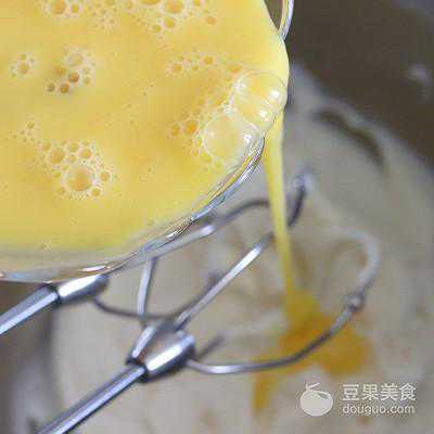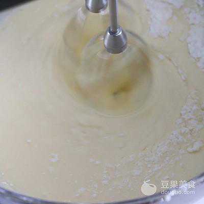 8、倒入蛋液,一边倒一边用电动打蛋器,搅打均匀并顺滑。