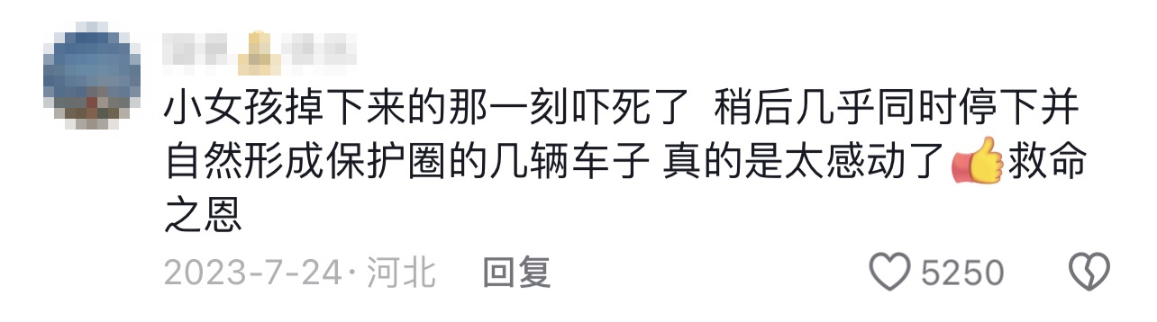 “小女孩掉下来的那一刻真的吓死了,稍后几乎同时停下来的车子为小女孩形成了保护圈,太感动了。”