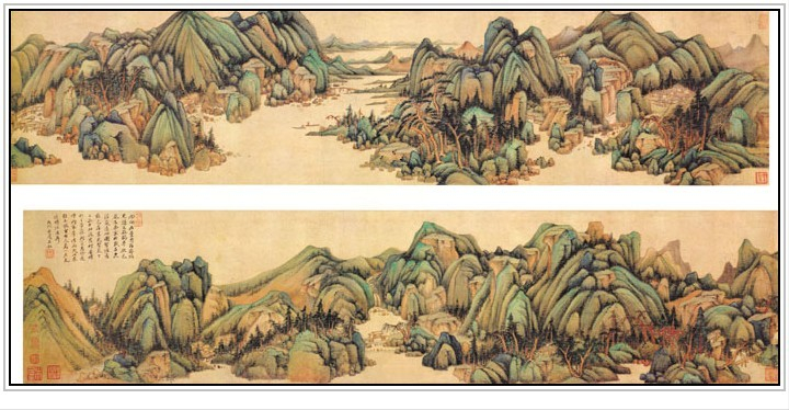 《青绿山水图》纸本,设色,纵:23厘米,横:198.7厘米北京故宫博物院藏。