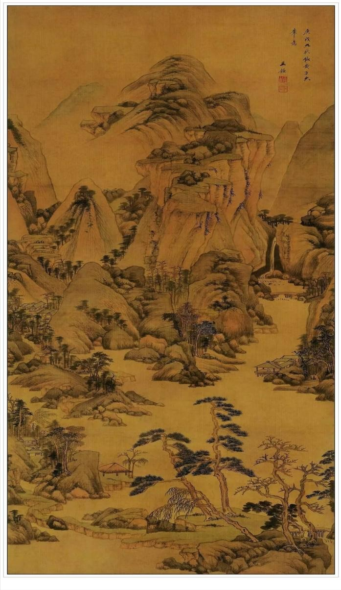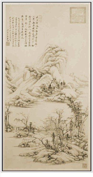 此图原名《仿黄子久山水图》。绘山峦起伏,林木丛生,山林深处村屋坐落,一股清泉直下。近处溪流清澈,水榭石堤,意境幽深。用笔秀丽,皴染精到,滋润浑厚,气韵苍莽。自识“庚戌九秋仿黄子久笔意,王鑑”,钤“王鑑之印”白文、“湘碧”朱文方印(按:庚戌为康熙九年,公元一六七0年,作者时年七十三岁),为王鉴晚年佳作。构图繁而不乱,山石错落有致,而且笔法华润圆细,秀逸中不失严谨,纤细而不流于柔弱,刚柔并济,浓淡兼施,皴染同举,别有风采。