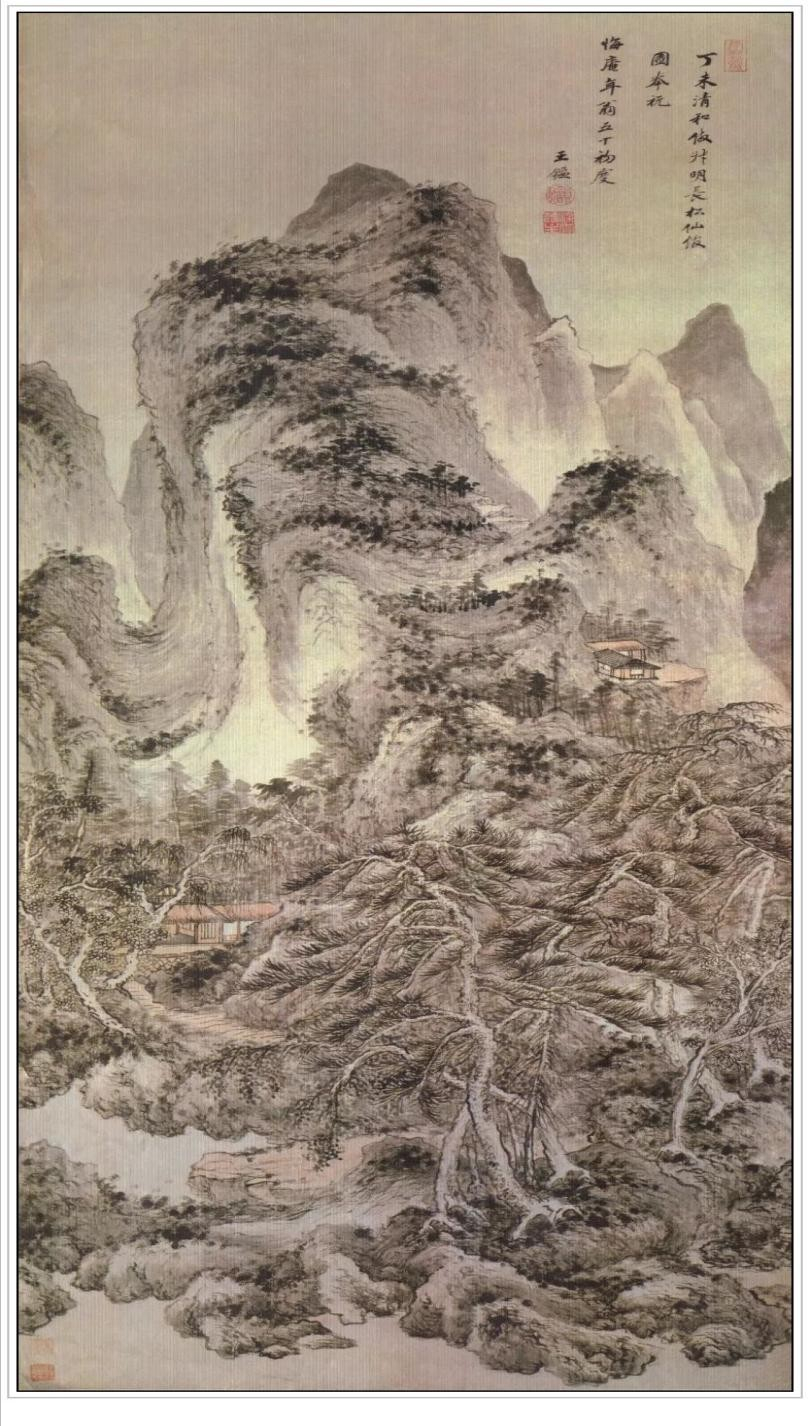 此图笔法全学王蒙,构景幽深。笔墨苍莽淹润,大胜其晚岁一般尖秀用笔的作品,是画家晚年的杰出作品。自识“丁未清和仿叔明长松仙馆图,奉祝悔庵年翁五十初度。王鑑”。钤“雨新斋”、“圆照”朱文印,“染香庵主”白文印。按丁未为康熙六年,公元一六六七年,作者时年七十岁。上款“悔庵”为尤侗,字同人,号悔庵,江苏苏州人。顺治五年拔贡,薦鸿博,授检讨,官侍读,善法书。“丁未”年恰是尤侗五十岁。