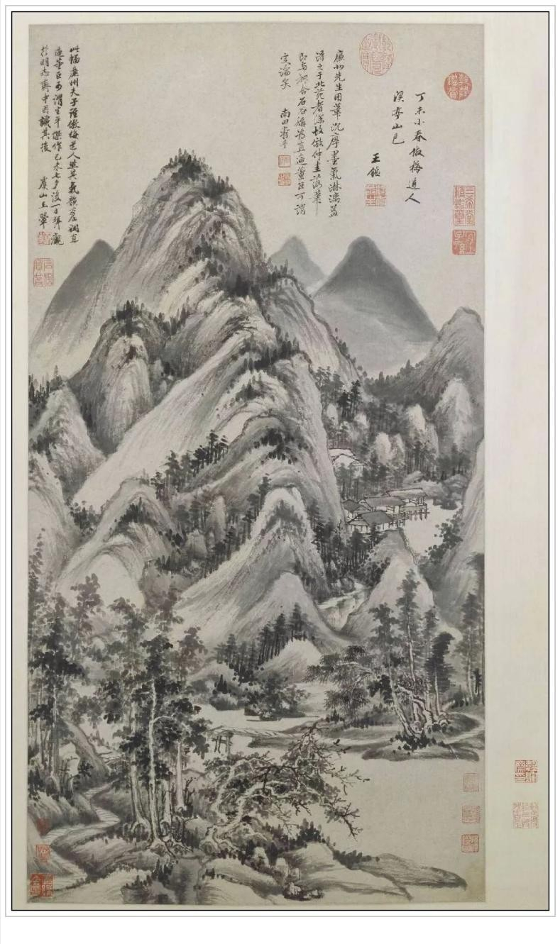 王鉴此图画层层山峦簇拥主峰,苍翠丛林之中,村舍水阁错落,山石用长披麻皴,深得巨然之韵。