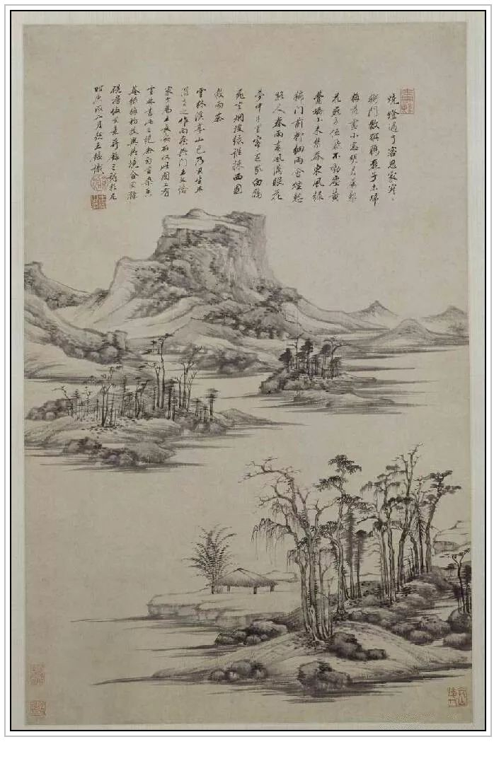 据款题而知此图是王鉴出游武林期间观“朱相国家所藏元四大家真迹”后挥毫所作。从中可见作者对“元四家”黄公望、吴镇、倪瓒、王蒙笔墨的潜心摹写以及他融会贯通后的综合运用能力。作品疏朗恬然的构图,秀逸遒劲的山石线条,交叠厚重的墨点,均表现出元代山水淡泊怡情的文人画格调。此图堪称作者仿元四家笔墨之集大成者。