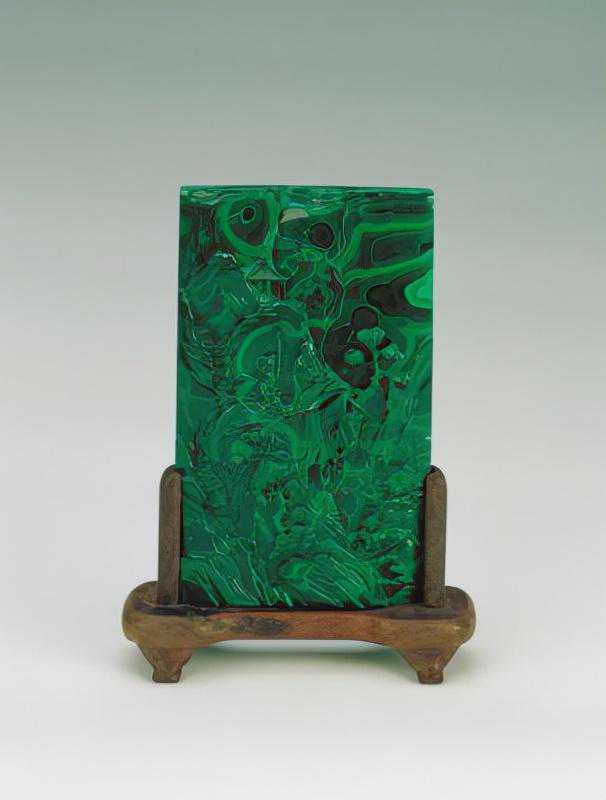 孔雀石是铜的表生矿物,因含铜量高,所以呈绿色或暗绿色,古时亦称之为“石绿”。据《本草纲木》载:“石录生铜坑内,乃铜之祖气也,铜得紫阳之气而绿,绿久则成石,谓之石绿。”因其颜色和它特有的同心圆状的花纹犹如孔雀美丽的尾羽,故而得名,也因此尤为珍贵。