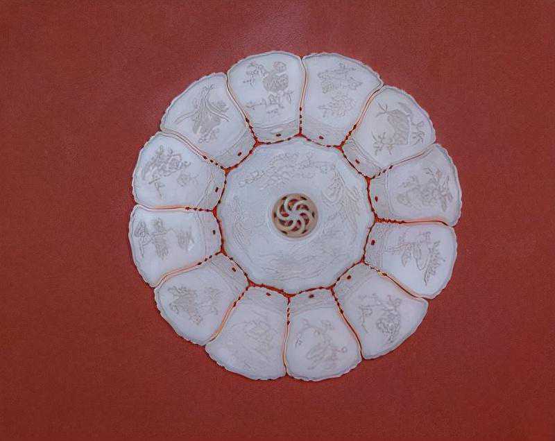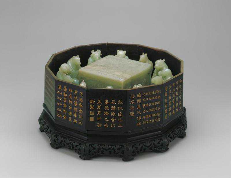 盛放玉器的紫檀木盒为十二角形。盒盖面中间为阳文篆书“万年甲子”,外围篆书“子丑寅卯辰巳午未申酉戌亥”一周,再外围是两圈各种篆体组成的“万寿”字样。盒盖内为填金隶书“用十二辰本事题四库全书”,末署“乾隆乙未夏御制”,并阴刻“几瑕怡情”篆书四字方印。盒外侧十二面有隶书填金乾隆御制诗。木盒底座为镂空雕花十二面围栏,并出十二云形足。