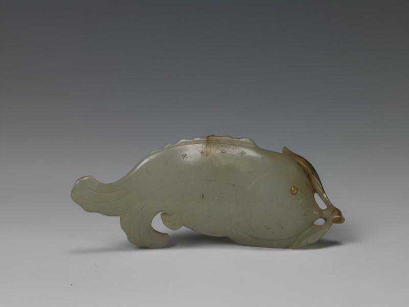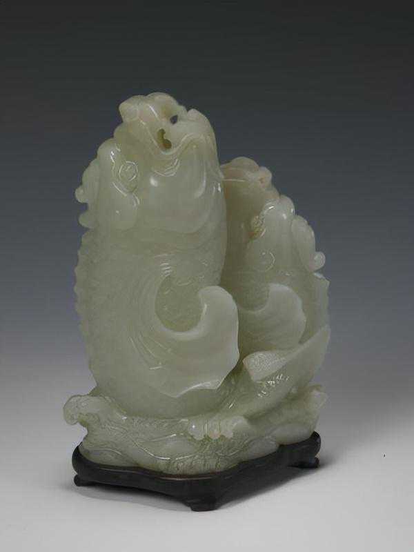 青玉衔莲水座大鱼,清,长24.5cm,高13.5cm。