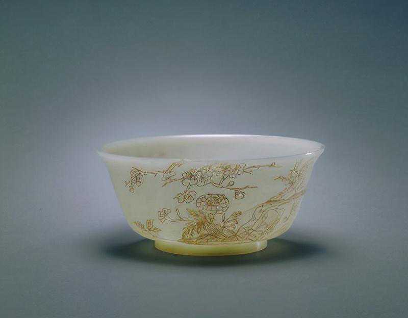 碗为青白玉质地,圆形,撇口,圈足。内壁光素,外壁一侧琢阴线填金梅花和菊花纹,另一侧镌隶书填金御制诗一首。