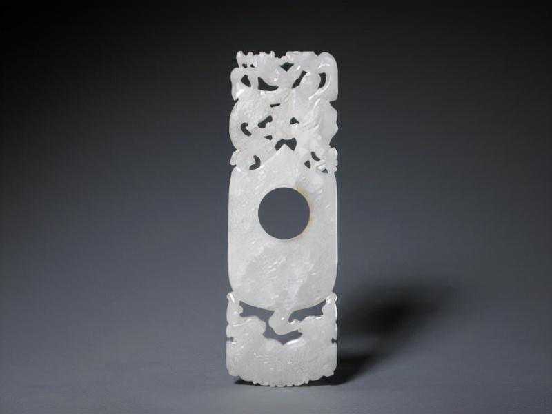 碧玉镂雕夔龙璜,清,长14.8cm,宽5.2cm,捐献自章乃器。