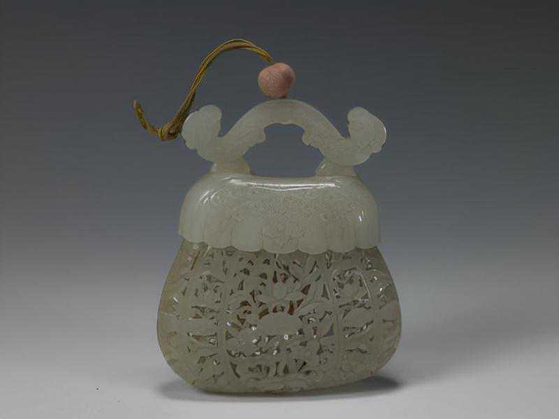 白玉镂雕荷包式香囊,清,高8.9cm,宽7.3cm,厚2.4cm。