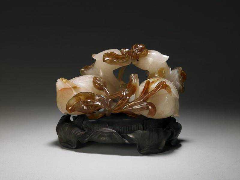 巧作,也称俏色,主要是利用材料本身的不同颜色进行加工。玉俏色最早见于商代,如安阳小屯商代遗址曾出土两件俏色玉龟。唐代以后,特别是清代,巧作技艺更加成熟。由于玛瑙自身具有丰富的纹理和色彩,施以巧作,魅力更显独特,所以历代留下不少玛瑙巧作的作品,如唐代用缠丝玛瑙雕成的牛首杯、明代红白玛瑙李白像以及清代的本件作品,均展示了玛瑙俏色作品令人惊叹的艺术魅力。