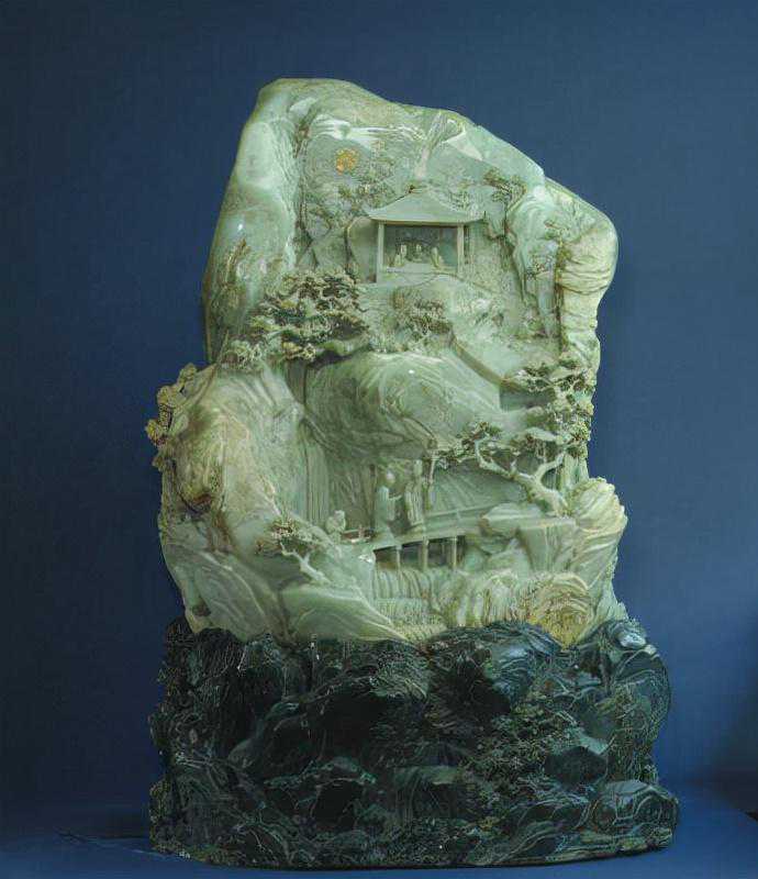 此器既有玉皮的黄色,又在翠绿中含有白色,绿白分明,黄绿相间,色彩鲜艳。全器构图合理,景物比例适当,透视感强,是非常珍贵的山形陈设品。