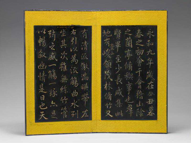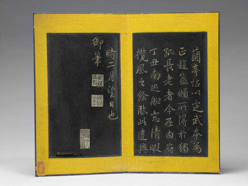 此册木嵌玉字,8片,乾隆御笔。文后有“乾隆宸翰”等印文。《兰亭序》是东晋右军将军王羲之51岁时的得意之笔,记述了他与当朝众多达官显贵、文人墨客雅集兰亭、修稧事也的壮观景象,抒发了他对人之生死、修短随化的感叹。《定武本》是唐代大书法家欧阳珣的临本,于北宋宣和年间勾勒上石,因于北宋庆历年间发现于河北定武而得名。定武原石久佚仅有拓本传世,此本为原石拓本,是定武兰亭刻本中最珍贵的版本。