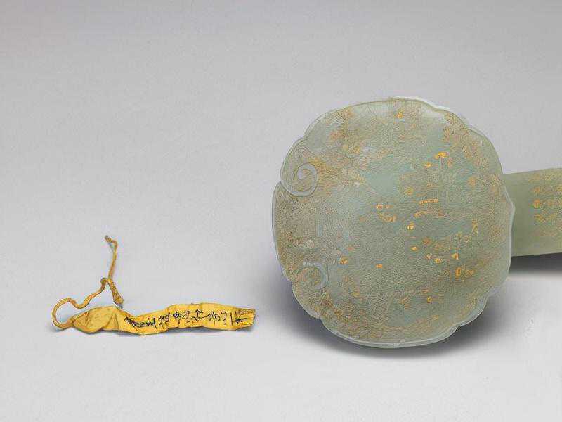 乾隆帝一生曾于十六年、二十二年、二十七年、三十年、四十五年、四十九年六次南巡。柄上文字系乾隆二十二年(1757年)二月,乾隆第二次南巡途中,乘船饱览风物之余,一时遣兴所临。黄条一面墨书“道光十八年五月初一日收宁寿宫交”,另一面“青玉诗意如意一柄”,可知此如意道光十八年(1838年)五月初一日前曾陈放于宁寿宫中。