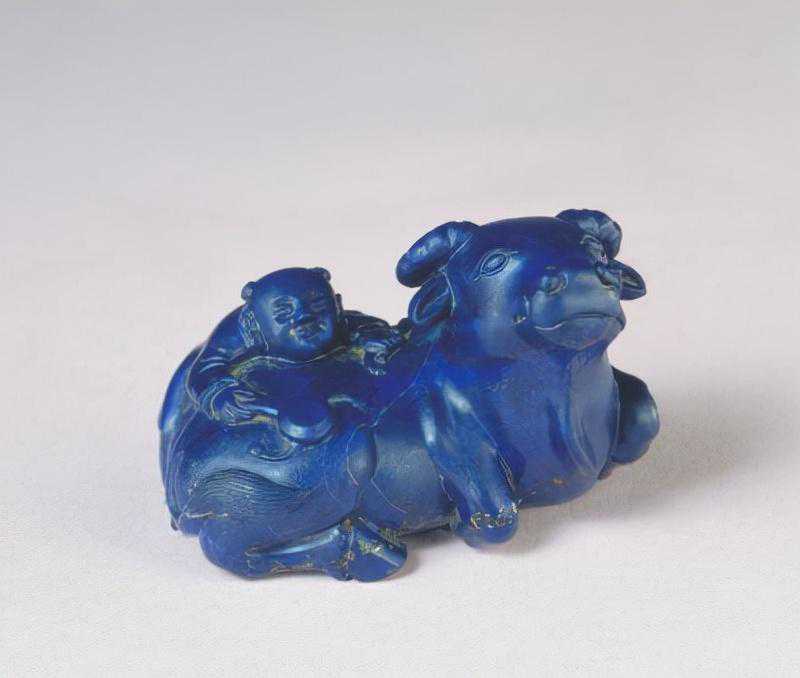 青金石牧童骑牛,清,高4.4cm,长6.5cm,宽5.3cm。