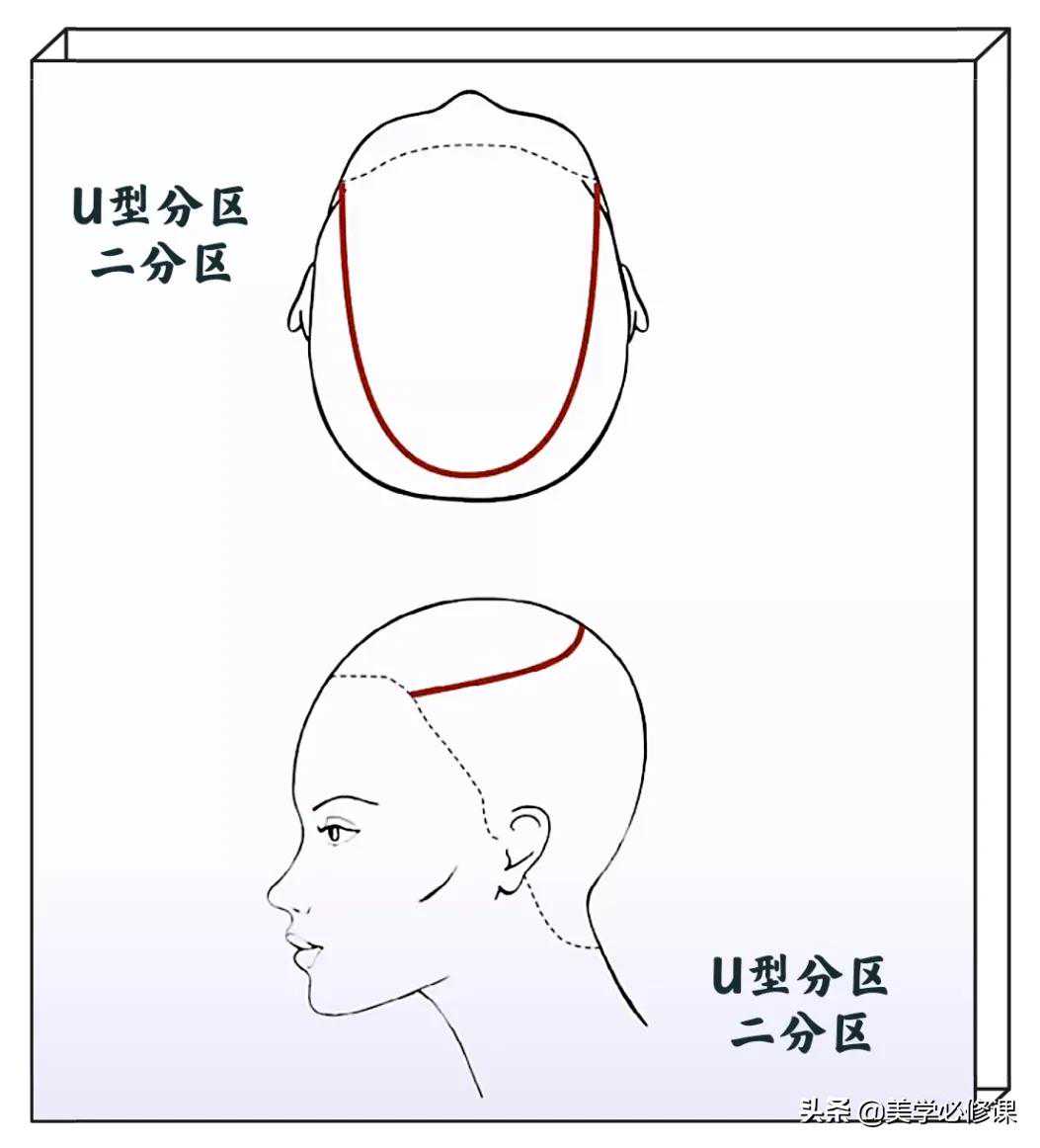 第二种:U型分区,可分为动感层次区和重量区,也就是美发人常用的二分区。