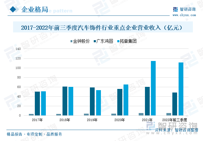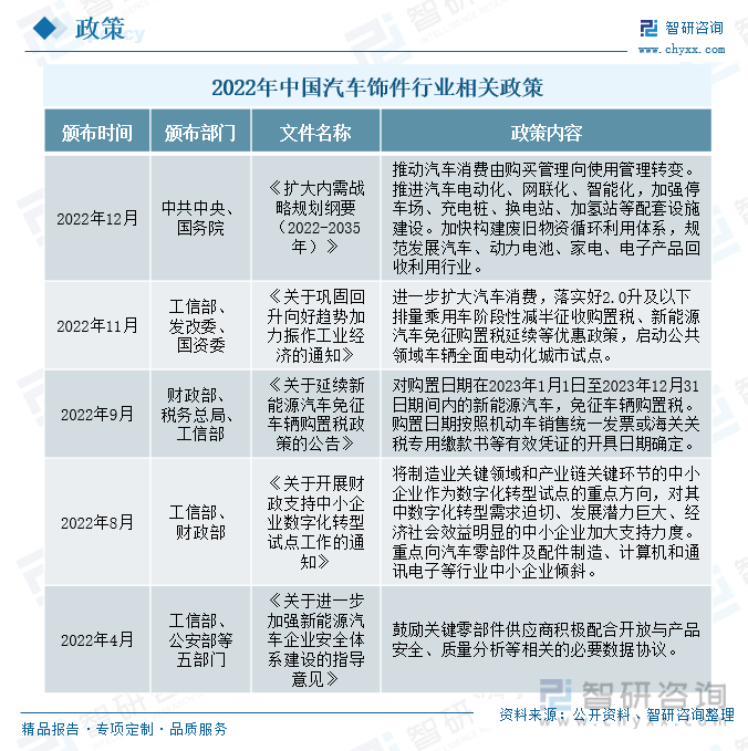 以上数据及信息可参考智研咨询发布的《2023-2029年中国汽车饰件行业竞争现状及投资机会分析报告》。智研咨询是中国产业咨询领域的信息与情报综合提供商。公司以“用信息驱动产业发展,为企业投资决策赋能”为品牌理念。为企业提供专业的产业咨询服务,主要服务包含精品行研报告、专项定制、月度专题、可研报告、商业计划书、产业规划等。提供周报/月报/季报/年报等定期报告和定制数据,内容涵盖政策监测、企业动态、行业数据、产品价格变化、投融资概览、市场机遇及风险分析等。