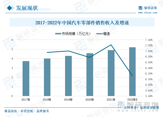 汽车饰件作为汽车零部件中重要的组成部分,随着汽车产业的稳步发展,汽车零部件行业也得到持续优化和提升。近年来,我国汽车零部件行业的销售收入保持稳定增长的态势,预计到2022年销售收入将会进一步增长,达5.2万亿元左右。汽车产业作为我国国民经济的支柱产业,随着汽车产业稳步发展和转型升级,也将持续带动我国汽车零部件行业稳定发展,拉动汽车饰件行业产品持续优化、生产工艺稳步提升,助推汽车饰件行业发展提速。