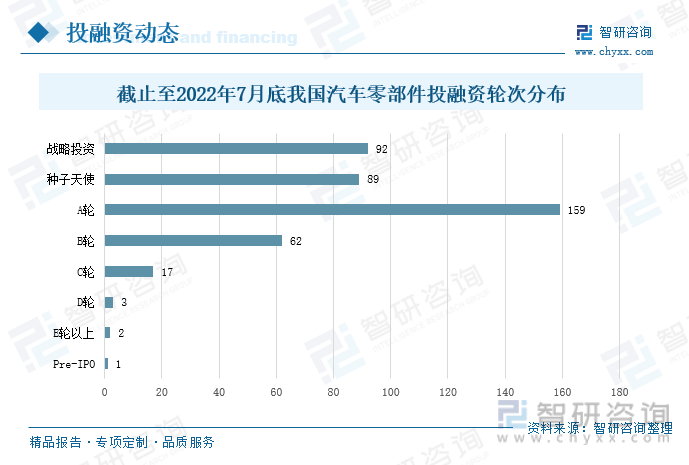 汽车零部件行业作为汽车整车的上游行业,是支撑和影响汽车工业发展的核心环节,也是汽车行业的基础和重要组成部分。汽车零部件行业的稳步发展,对汽车产业的发展有着很大的促进作用。据IT桔子数据统计,截止到2022年7月31日,我国汽车零部件行业共发生投融资事件473起,其中A轮融资占比最多,达到159起,其次是战略投资和种子天使轮融资,投资件数分别为92起、89起。