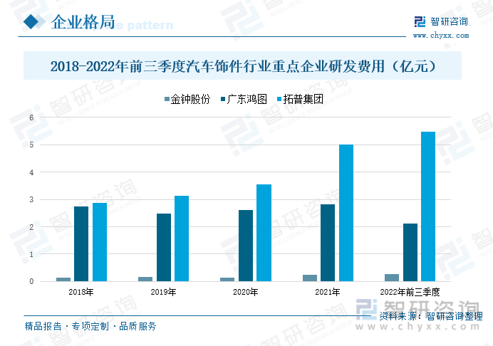 自主的技术创新能力和持续的研发投入是汽车内外饰件企业不断深入整车厂商供应体系的重要保障,近年来,金钟股份始终高度重视研发创新,持续加大研发费用的投入情况,现阶段在研项目包括新型PVD镀膜格栅技术、新型高性能汽车字标贴背胶装置、新型高性能防水悬浮车标等。2022年前三季度金钟股份的研发费用投入共计0.26亿元,较2021年同期增长了51.1%。面对汽车行业的稳步回升,新能源汽车产业的快速发展,广东鸿图在原有自主研发工艺的基础上,进一步加大研发投入,扩大产品的研发领域,目前汽车内外饰领域在研项目主要有透光透波材料开发、TOM覆膜工艺、碳纤维成型工艺等项目的研发。2022年前三季度广东鸿图的研发费用共计2.13亿元,较2021年同期增长了6.49%。为全面推进数字化工厂建设,加快制造工艺和产品质量控制的研发,近年来,拓普集团持续加大研发费用的投入,研发费用增长呈现出持续上涨的态势,其中2021年在行业加速发展的促进下,研发费用同比增长了41.61%。2022年前三季度拓普集团的研发费用投入共计5.47亿元,较2021年同期增长了53.56%。