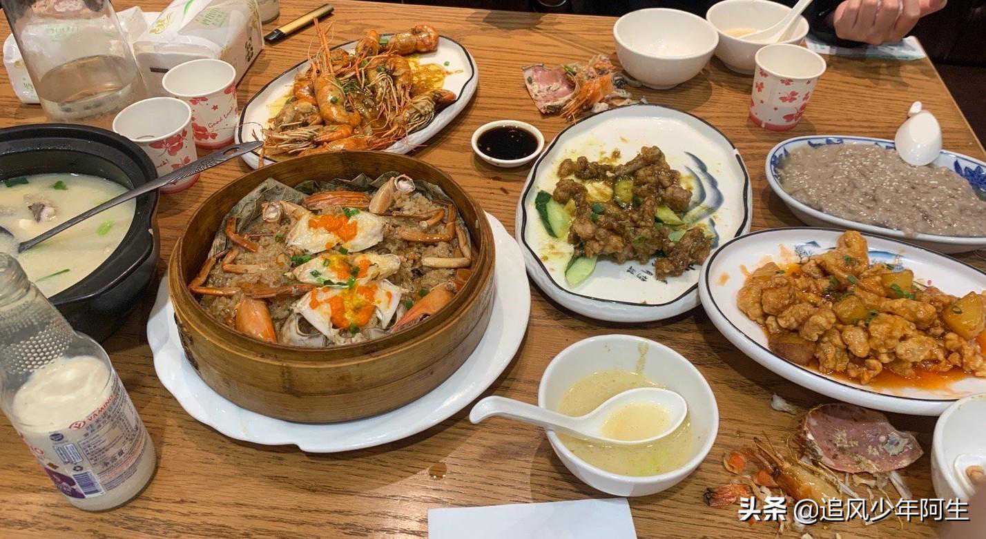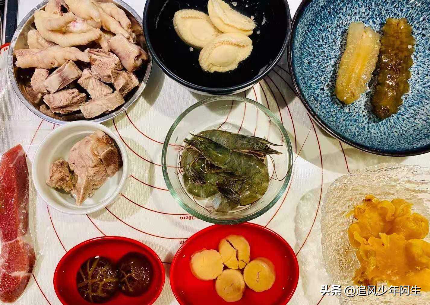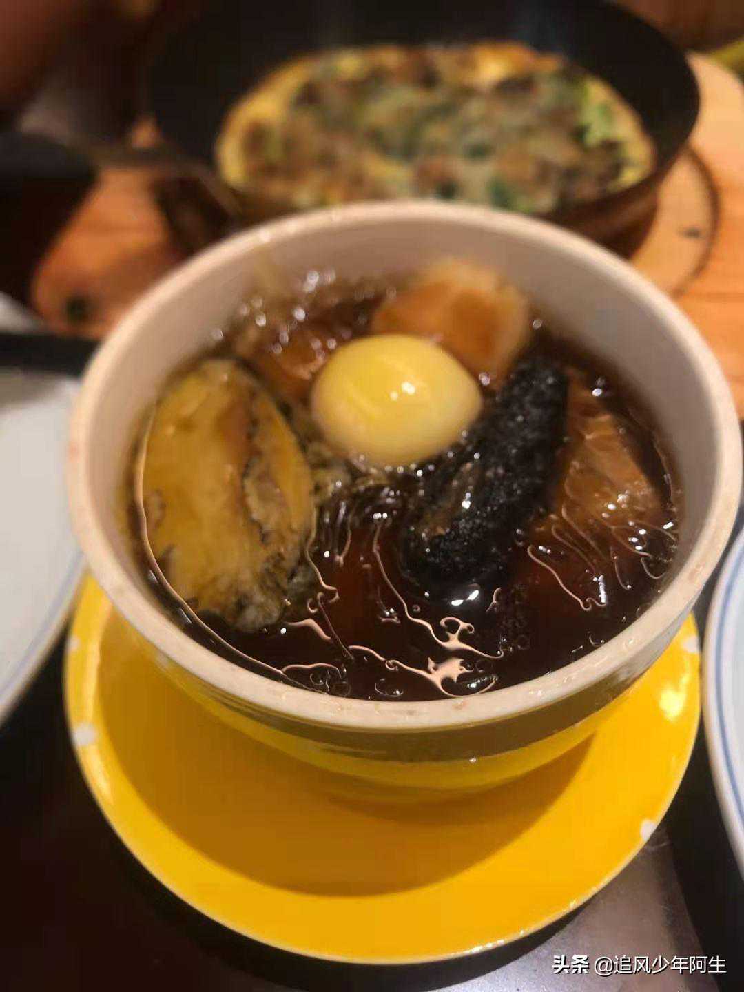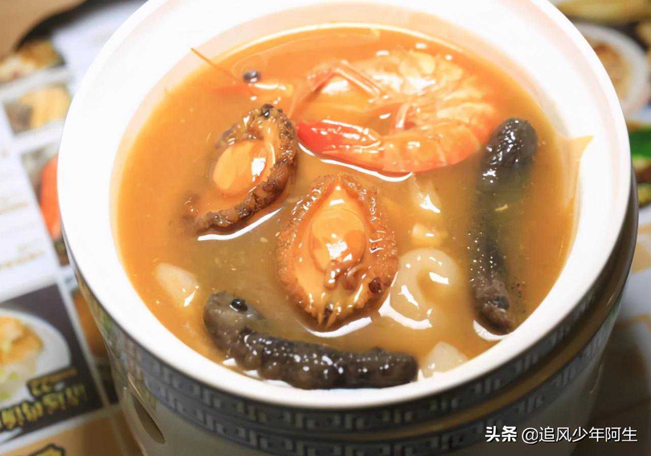 这是相当"土豪"的一道菜:看得见的入口食材有鱼翅、鲍鱼、海参、花胶、瑶柱、猪蹄筋、鸽蛋、花菇、猪肚等十余种,看不见的调汤材料再来十余种,像凤爪、牛肉这种寻常人家的中高档菜在此菜中已沦为"下九流",仅用来调底汤,坛中不得见。虽说福建依山傍海,任性到可以将各种山珍海味"乱炖"一气,但各种食材先下后放,炸烧炖煨各用其法,文火武火交替相攻,绍兴酒浇起荷叶封口,每个步骤都有讲究。